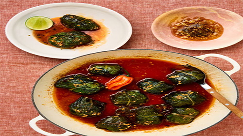 At the heart of this dish are lamb-stuffed rainbow chard rolls, simmered in a fragrant tomato broth infused with a whole scotch bonnet chili. The lamb filling is seasoned with a blend of curry powder, dried mint, allspice, and fresh coriander, creating a savory and aromatic base. The tomato broth, enriched with tomato paste and a hint of sea salt, serves as a flavorful cooking medium, while the scotch bonnet chili imparts a subtle but fiery heat that elevates the dish.